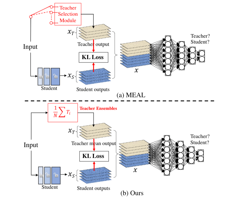 工作之前,首先要简单回顾一下它的最初版本 MEAL,其基本的也是核心的思想是将多个 teacher 网络的知识通过蒸馏的方式压缩进一个 student 里面,同时它提出使用辨别器(discriminators)作为正则模块(regularization)防止 student 的输出跟 teacher 过于相像,从而防止 student 过拟合到训练集上。