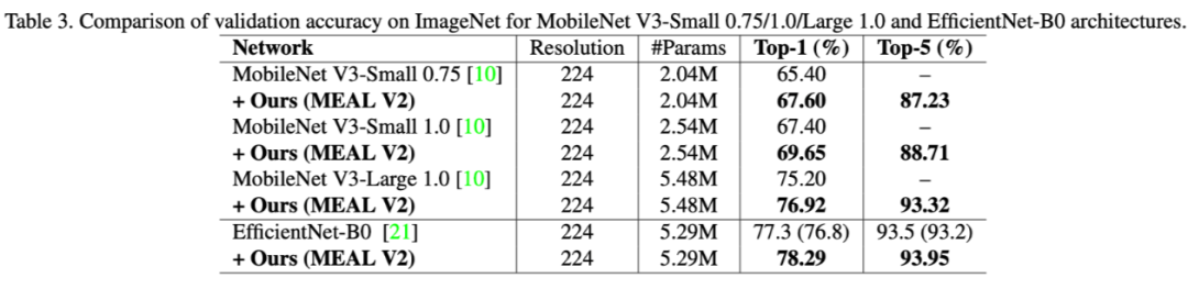 ,包括 MobileNet V3,EfficientNet-B0 等等,从表格 3 我们可以看到基本在这些网络上都能有 2 个点以上的提升,所以 MEAL V2 整个框架其实可以看成是一个后增强的过程,即我们可以先设计和训练一个自己的模型,然后放入 MEAL V2 的框架中进一步提升它的性能。