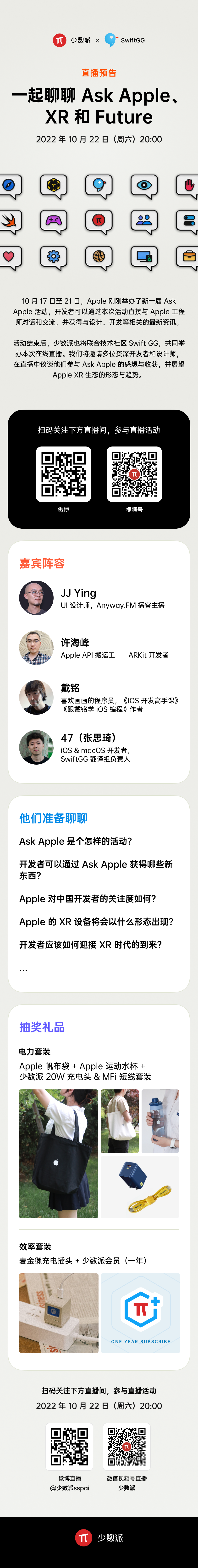在活动结束后,少数派也将联合国内知名的技术社区 Swift GG,共同举办《和我们一起畅想 Apple 的 AR 与 VR》在线直播。我们将邀请多位资深开发者和设计师,在直播中谈谈他们参与 Ask Apple 的感想与收获,并展望 Apple XR 生态的形态与趋势。