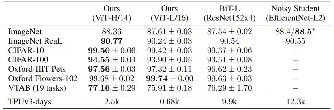 暴力美学:舍弃了CNN的归纳偏好之后(inductive biases such as translation equivariance and locality),反而更加有利于在超大规模数据上以自监督方式学习知识,即大规模训练胜于归纳偏好(large scale training trumps inductive bias),在众多图像分类任务上直逼SOTA。