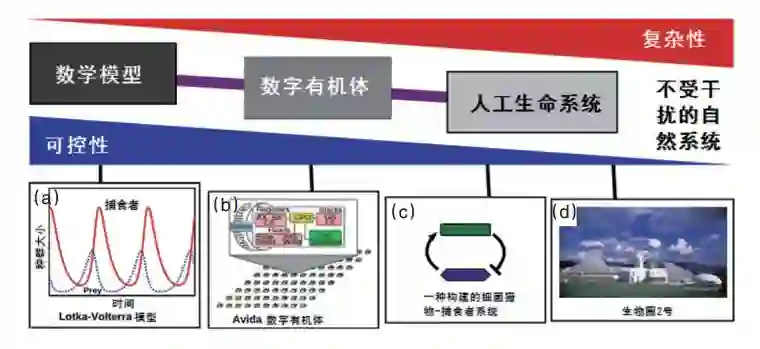 根据图 1,普遍地,从数学模型-数字有机体-人工生命系统-不受干扰的自然系统,其复杂性越来越高,可控性越来越低,真实性越来越高。数学模型和数字有机体倾向于抽象出生命系统最基本的和一般的方面,反映的是支配生态学的和进化的动力学抽象法则,其可控性最强,精确性最高,但是,它们不能彻底地对生物性质和进化变化进行取样,而是在实验基础上对自然对象进行了抽象化的模型和数学处理,其复杂性最低,真实性最低,其高的精确性是以低的真实性为代价的。人工生命系统由一系列小的生命有机体组成的系统,也叫“微宇宙”,保持了自然系统中生命实体丰富的行为特征和进化趋势,但是,又降低了自然系统中大量相互作用的物种的网络复杂性以及物种间的关联度,因此,其与自然系统有较大的契合,控制性较高,精确性较高,复杂性较高,真实性与较高。不受干扰的自然系统,在这里不是指没有受到人类活动影响的自然系统,而是指没有受到实验者干扰但是可能受到人类活动影响的自然系统,由于实验者对该对象系统没有进行任何处理,因此相较于前述几种系统,它的复杂性、真实性是最高的,控制性、精确性最差,其高的真实性是以差的精确性为代价的。