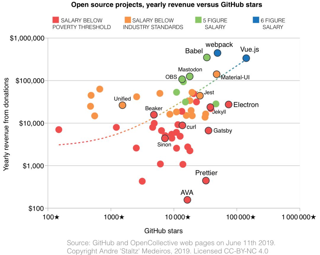 虽然有很多流行项目收入在贫困线以下,但这并不一定意味着从事这些项目的人很穷,因为维护人员也有可能在允许开源贡献的公司工作。