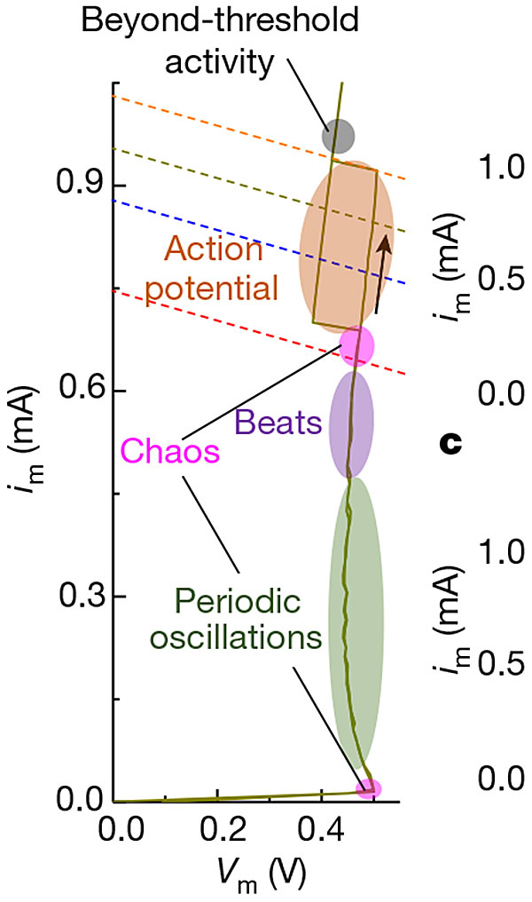 这并非不可能,近日,惠普实验室的 Suhas Kumar、R.Stanley Williams(现在为德州农工大学教授)以及斯坦福大学已故博士生 Ziwen Wang 发明了一种满足这些要求的设备。只需使用简单的直流电输入,这一设备不仅可以输出其他设备可以管理的简单脉冲,而且还可输出神经元的全部活动情况,包括脉冲爆发、自激振荡,以及大脑中出现的其他情况。