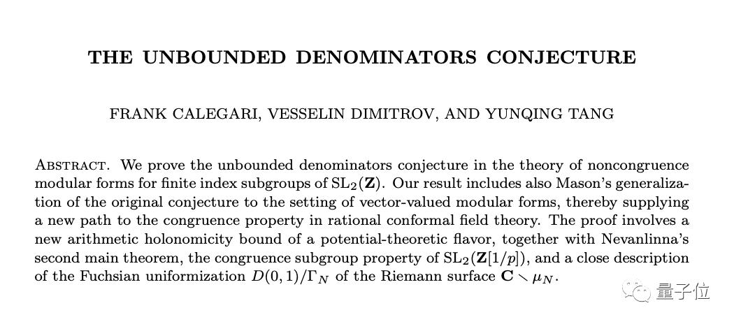 最新相关以及最具代表性的工作,就是今年同合著者一起成功证明了非同余子群无界分母猜想。