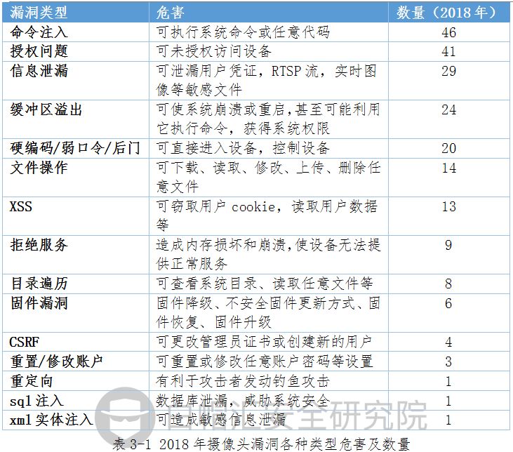 而另一方面,摄像头设备存在的漏洞类型包括权限绕过、拒绝服务、信息泄漏、跨站、命令执行、缓冲区溢出、 SQL注入、弱口令、设计缺陷等。