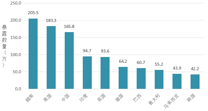 图片显示,截至11月底,全球共有228个国家8063个城市中的2635万摄像头设备对公网开放访问权限。其中越南位居第一,共有205万,约占20%;美国位列第二,共有183万,约占18%;中国位列第三,共有165万,约占17%;印度共有95万,约占10%;德国共有94万,约占9%。