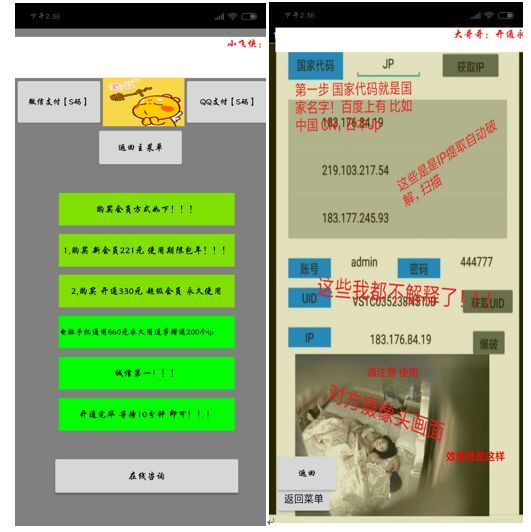 此外,部分黑产人员还通过出售APP的方式进行售卖操作。有特殊需要的人群只需通过APP账号充值的方式,就可获取在线观看隐私视频的权限。充值金额越高,所获得的摄像头IP地址“质量”就越高。这里所谓的“高质量”IP就是家庭卧室的摄像头。