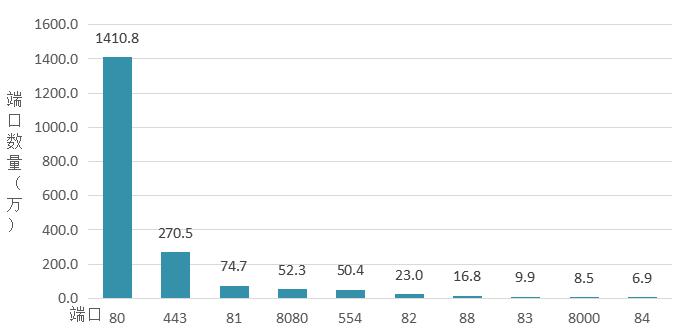 就摄像头设备暴露的网络端口而言,80端口数量最多,共有1410万,约占80%,443端口第二,共有270万,约占12%;81端口第三,共有75万,约占3%,8080端口第四,共有52万,约占2%;554端口第五,共有50万,约占2%;其他端口约占1%。