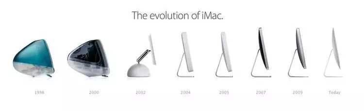 到了 2004 年,现代 iMac 的这种把主板、硬盘等部件放在屏幕后面的设计才基本定型。前两代 iMac 的那种半弧形设计消失了,取而代之的是方正硬朗的造型。在这之后 iMac 的更新则以提高屏幕分辨率和把后背做的更薄为主。
