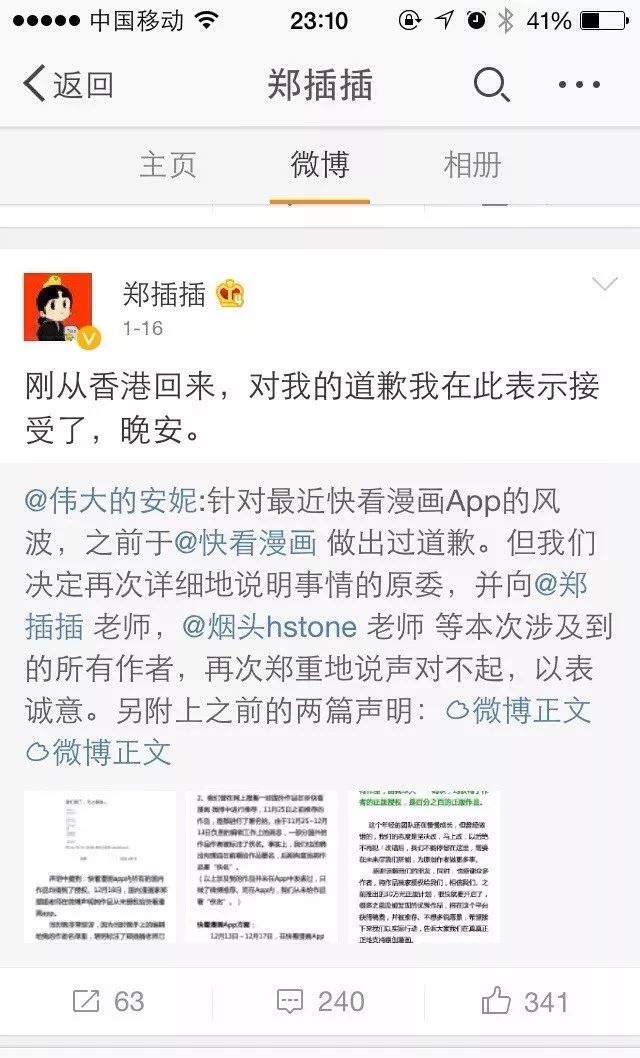 以这次被罚的快看漫画为例,2015年5月曾被网友曝出平台上存在抄袭@郑插插和@烟头hstone作品的内容。经过调查后发现确有此事,随后快看漫画创始人陈安妮、快看漫画官微都对此进行了道歉。
