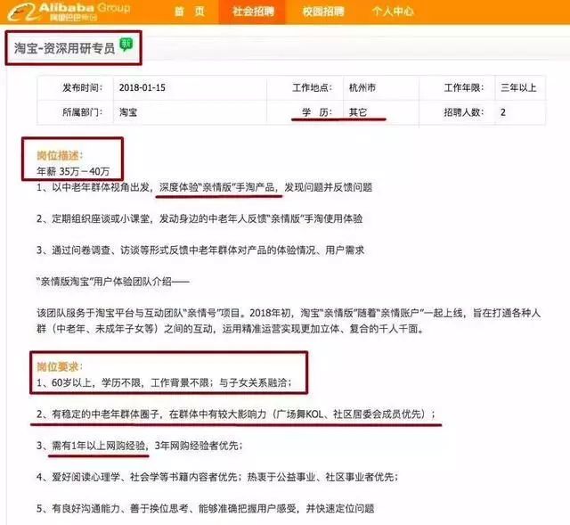 同样是今年年初,阿里巴巴发布了一则招聘,一度火遍网络:招聘60岁以上的产品体验官,年薪35万~40万。