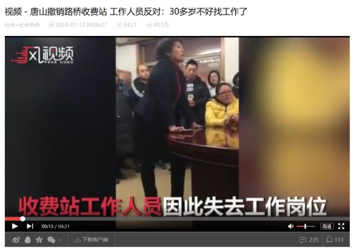 因为高速公路收费站改制,唐山市人民政府宣布,从1月8日起,所有收费站停止收费,一大波收费员被迫离职,一群收费站员工和政府工作人员的对话视频被上传到网络。