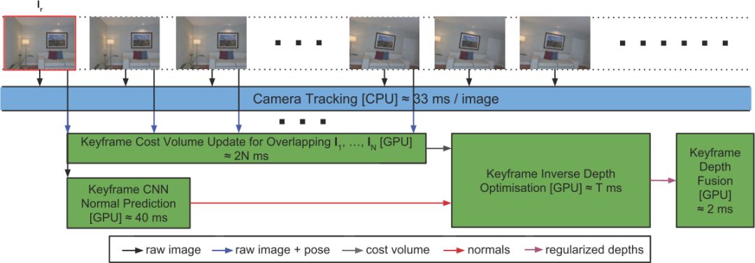 算法流程图如图3,图中所描述的步骤对每一个关键帧 Ir 都重复执行。其中:相机跟踪在主CPU线程里运行,误差量的更新和CNN法线预测都在GPU上运行,且设法与主线程同步。优化和深度融合随后运行,也与主线程同步。