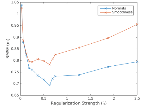图4 关键帧重建平均RMS误差(m) 关于正则化强度的变化