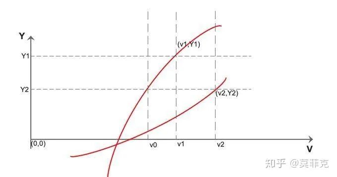 下面我们用具体图形展示会更加直观,假设有两个买家1和买家2,虚拟估价函数分别如下所示,当他们的估价分别是v1<v2时,买家1的估价函数斜率更大,函数对估价的变动更敏感,此时Y1(v1)>Y2(v2),此时买家1获得拍卖品,并且支付=v0,如下图所示: