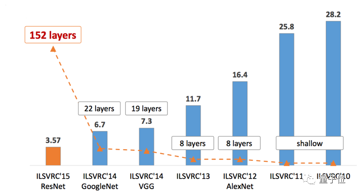 另外,我们还没有讨论准确率的问题,在图像识别竞赛ImageNet中,根据历年的结果,我们可以看出,随着神经网络层数的增加,准确率在不断提升。