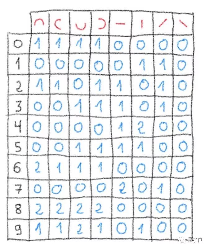 首先,考虑到0~9这十个数字,本身也是存在各种笔画的,那我们就拆解开来,看每个手写体数字里,有多少横竖撇捺,曲折弯弯。