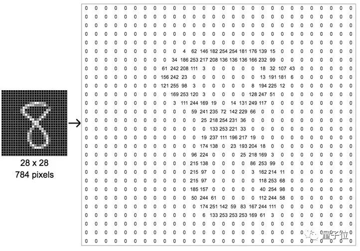 所以,看这个手写数字,一共28行28列,784个像素格子,没有笔画的黑色格子就是0,有笔画的部分,笔画中心是更浅的白色,数字在一两百左右,笔画边缘则是灰色,数字只有几十,这就构成了这个手写数字的矩阵。