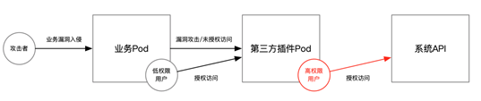 攻击者进入pod后,通过未授权访问或漏洞攻击第三方组件,并利用这些组件的权限操纵K8s集群。