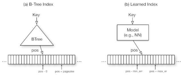 在语义保证方面,索引已经在很大程度上被学习模型所取代,这使得用其他类型的模型来代替它们也变得非常简单,如神经网络。例如,可以将B-Trees视为一个模型,它将一个键作为输入,并预测数据记录所在位置。一个Bloom-filter是一个二进制分类器,它基于一个键来预测一个键是否存在于某个集中。很明显,存在细微但重要的区别。例如,一个Bloom-filter可能有假阳性,而不是假阴性。然而,正如我们将在本文中展示的那样,通过全新的学习技术和/或简单的辅助数据结构,解决好这些差异性事非常有可能的。