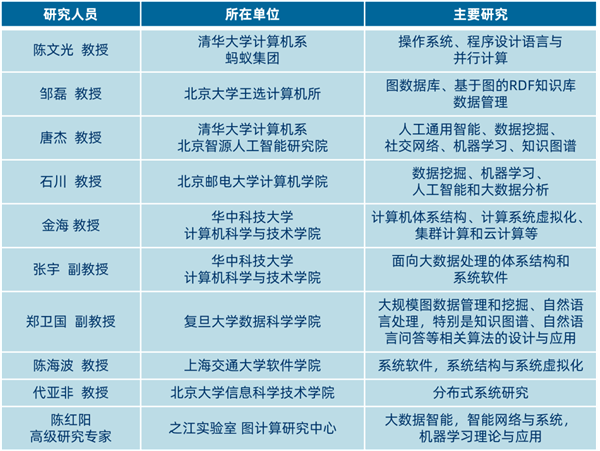 下表为国内图计算领域的部分研究学者,主要研究领域横跨了图数据、操作系统、人工智能、大数据、分布式系统等,他们不仅在基础理论层面研究深耕,也在产业化实践方面不断更迭创新,助力图计算在大数据的沃土里生根发芽。