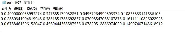打开具体的标注文件,你将会看到下面的内容,txt文件中每一行表示一个目标,以空格进行区分,分别表示目标的类别id,归一化处理之后的中心点x坐标、y坐标、目标框的w和h。