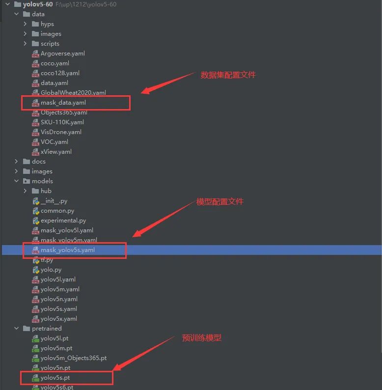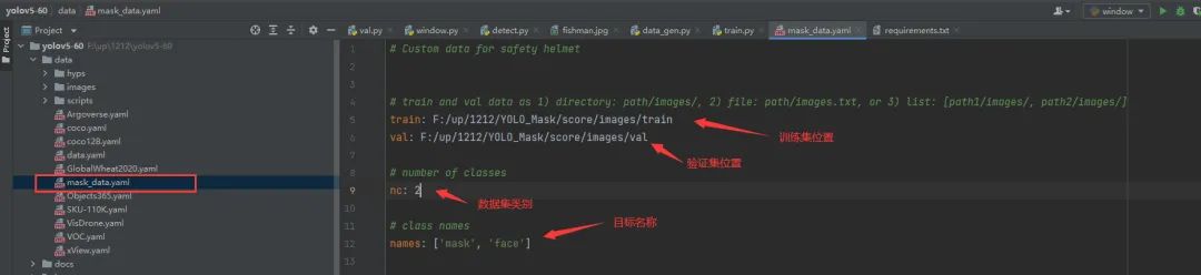 这里的配置文件是为了方便我们后期训练使用,我们需要在data目录下创建一个mask_data.yaml的文件,如下图所示:
