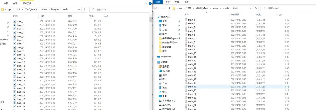 标注完成之后你会得到一系列的txt文件,这里的txt文件就是目标检测的标注文件,其中txt文件和图片文件的名称是一一对应的,如下图所示: