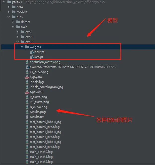 在train/runs/exp3的目录下可以找到训练得到的模型和日志文件