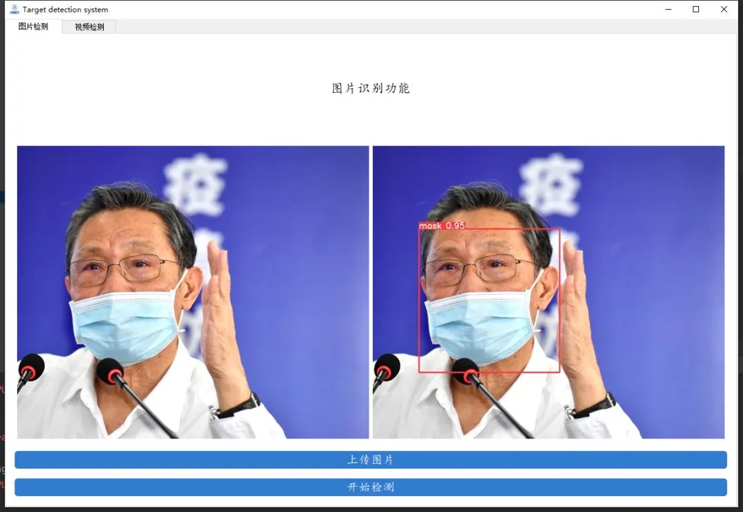先来看看我们要实现的效果,我们将会通过数据来训练一个口罩检测的模型,并用pyqt5进行封装,实现图片口罩检测、视频口罩检测和摄像头实时口罩检测的功能。