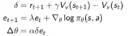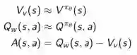 Advantage 函数可以明显减少状态价值的变异性,因此算法的Critic部分可以去估计advantage函数而不是仅仅估计行为价值函数。在这种情况下,我们需要两个近似函数也就是两套参数,一套用来近似状态价值函数,一套用来近似行为价值函数,以便计算advantage函数,并且通过TD学习来更新这两个价值函数。数学表示如下:
