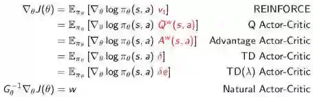 重提了许许多多形式的策略梯度函数的形式,都是用随机梯度上升算法;同样Critic部分使用策略评估来实现,这个在之前的lecture里讲过,可以使用MC或者TD,TD(λ)等去估计状态价值函数 、行为价值函数 或advantage函数 等。