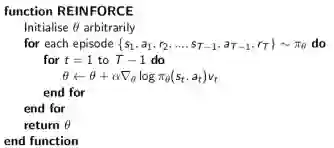 从t=1到t=T-1间的每一个时刻,计算个体获得的收获 ,然后更新参数θ。如此然后重复每一个Episode,直到结束。具体算法如下: