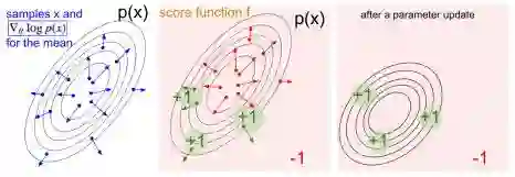 图解翻译:使用score function估计梯度的可视化。左:高斯分布下的一些采样(蓝点),针对每一个蓝点也画出了根据高斯分布均值得到的概率对数的梯度。箭头指示的方向是能够增加该采样点采样概率的分布的均值(对于高斯分布来说,是等值线的中心点)移动的方向;中:大多数采样点对应的score function值是-1,除了一小块区域是+1(score function可以是任意、并且不要求可微的标量函数),此时箭头用不同颜色表示,在随后的更新中,我们将要把所有绿色的值和负的红色值进行平均来更新分布参数(均值);右:参数更新后,绿色箭头的方向和红色箭头的反方向推动了行程均值朝着左下方移动的新的高斯分布,从这个新分布的采样将会按照预期有一个较高的score。