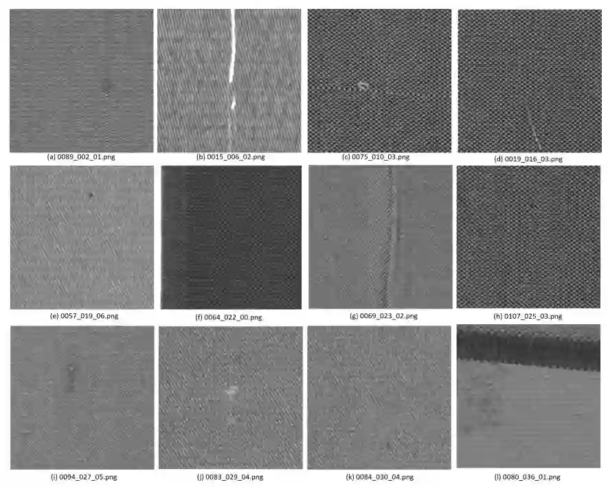 该数据库由七个不同织物结构的245张4096 x 256像素图像组成。数据库中有140个无缺陷图像,每种类型的织物20个,除此之外,有105幅纺织行业中常见的不同类型的织物缺陷(12种缺陷)图像。图像的大尺寸允许用户使用不同的窗口尺寸,从而增加了样本数量。Internet上的数据库还包含所有具有缺陷的图像的分割mask,使得白色像素表示缺陷区域,其余像素为黑色。