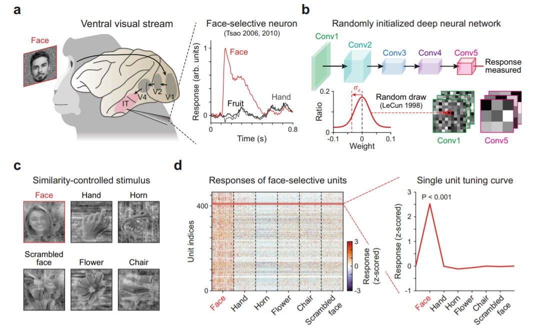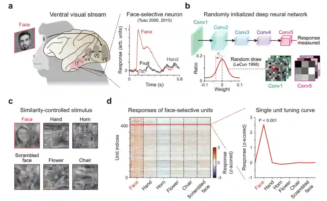 近日,韩国科学技术院(KAIST)生物脑工程系教授 Se-Bum Paik 领导的研究小组为这个问题贡献了一份颇具参考价值的结果。他们发现,即使是完全没有经过训练的深度神经网络,也可以产生对面孔图像的视觉选择性。具体来说,在完全没有学习的情况下,他们在随机初始化的深度神经网络中观察到对面孔图像有选择性的神经元活动,这些活动显示出在生物大脑中观察到的那些特征。