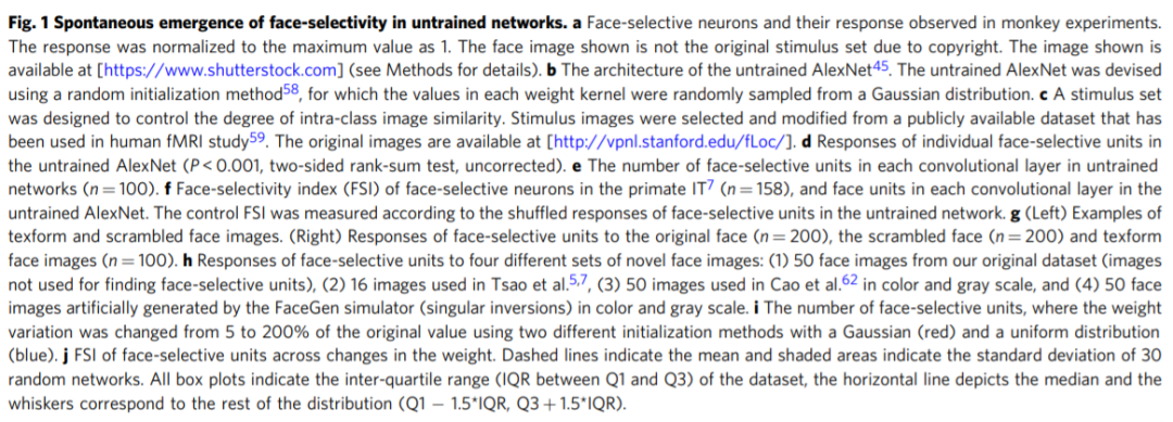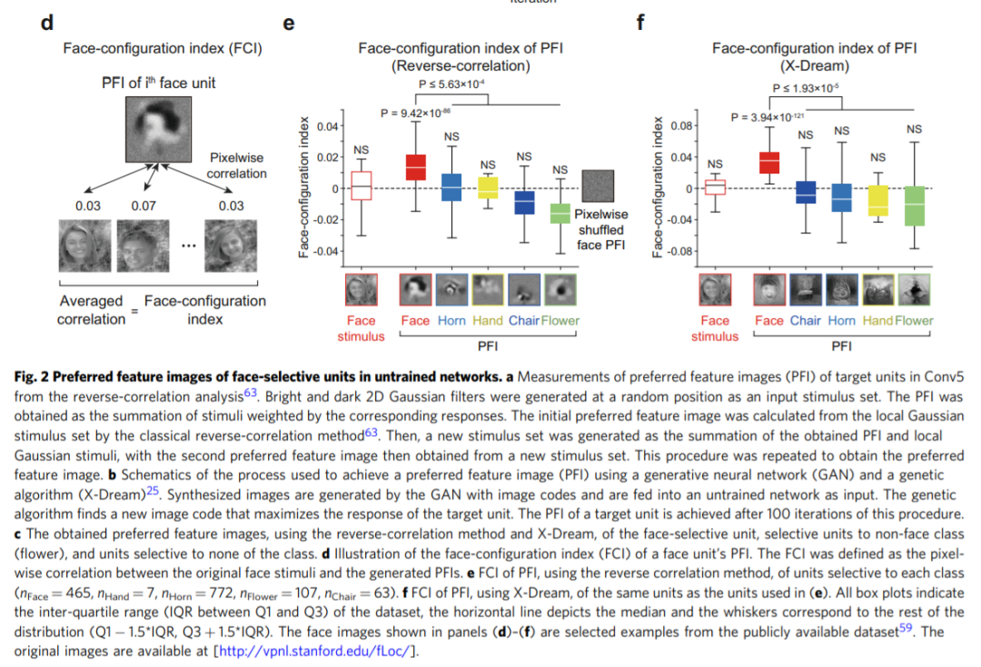 利用捕捉视觉皮层腹侧流(ventral stream)特性的模型神经网络——AlexNet45,研究小组发现,面孔选择性可以在随机初始化的 DNN 的不同条件下稳健地出现。而且,它们的面孔选择性指数(FSI)与那些在大脑中观察到的面孔选择性神经元相当。