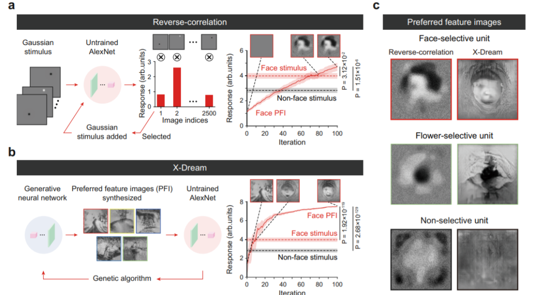 借助反向相关(RC)方法和生成对抗网络获得的优选特征图像(preferred feature image)表明,面孔选择单元对类面孔配置是有选择性的,与没有选择性的单元不同。此外,面孔选择单元使网络能够执行面孔检测。