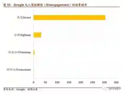 Google无人驾驶解除(Disengagement)的场景排序是:城市街道(Street),普通公路(Highway),高速公路(Freeway),洲际公路(Interstate)。