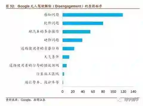 Google无人驾驶解除(Disengagement)的原因排序前五的是:感知问题、软件问题、对汽车的多余操作、硬件问题、道路使用者的鲁莽行为。