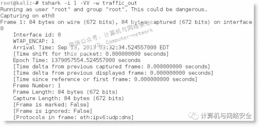 部署一个数据包嗅探器来映射流量将会帮助你识别主机名、活跃子网和域名。如果DHCP地址没有启用,它也将允许攻击者确定任何未使用的、静态的IP地址。Kail预先配置使用Wireshark(基于GUI的数据包嗅探器),但是你可以在一个后期利用脚本中,或者在命令行使用tshark,如下图所示。