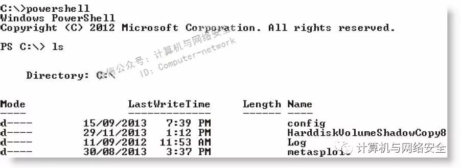 PowerShell支持一些被称为cmdlets的内置函数。PowerShell的优点之一是由于cmdlets是常见的UNIX命令的别名,所以在键入ls命令将返回一个典型的目录列表,如下图所示。