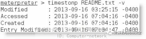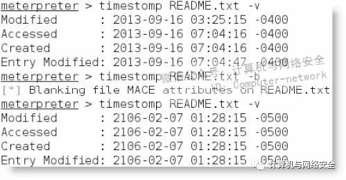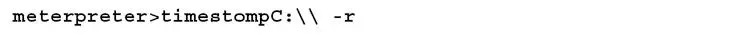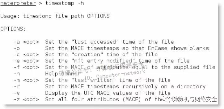 Metasploit有一个绝招,那就是timestomp选项,它允许攻击者更改一个文件的MACE参数(一个文件的最后一次修改、访问、创建,以及MFT入口修改时间)。一旦系统被入侵,并且一个meterpreter shell已经建立,timestomp就会被调用,如下图所示。
