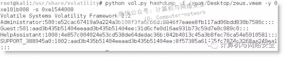 对一个被恶意软件Zeus感染的系统中的样本图片(https://code.google.com/p/volatility/wiki/SampleMemoryImages),我们将用Volatility框架来获取加密的LanMan口令散列值。