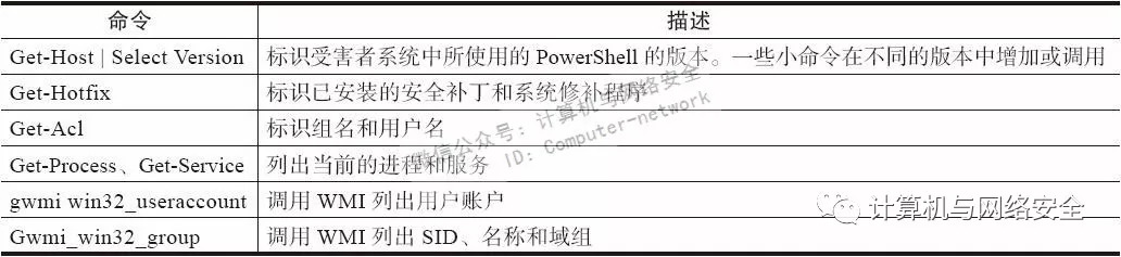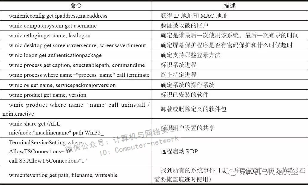 针对新的目标系统,攻击者和渗透测试人员利用内置的脚本语言。例如,Windows设备管理命令行(Windows Management Instrumentation Command-line,WMIC),通过使用命令行和脚本界面来简化访问Windows配置。如果被渗透系统支持WMIC,可以通过一些命令来收集信息。请参见下表。