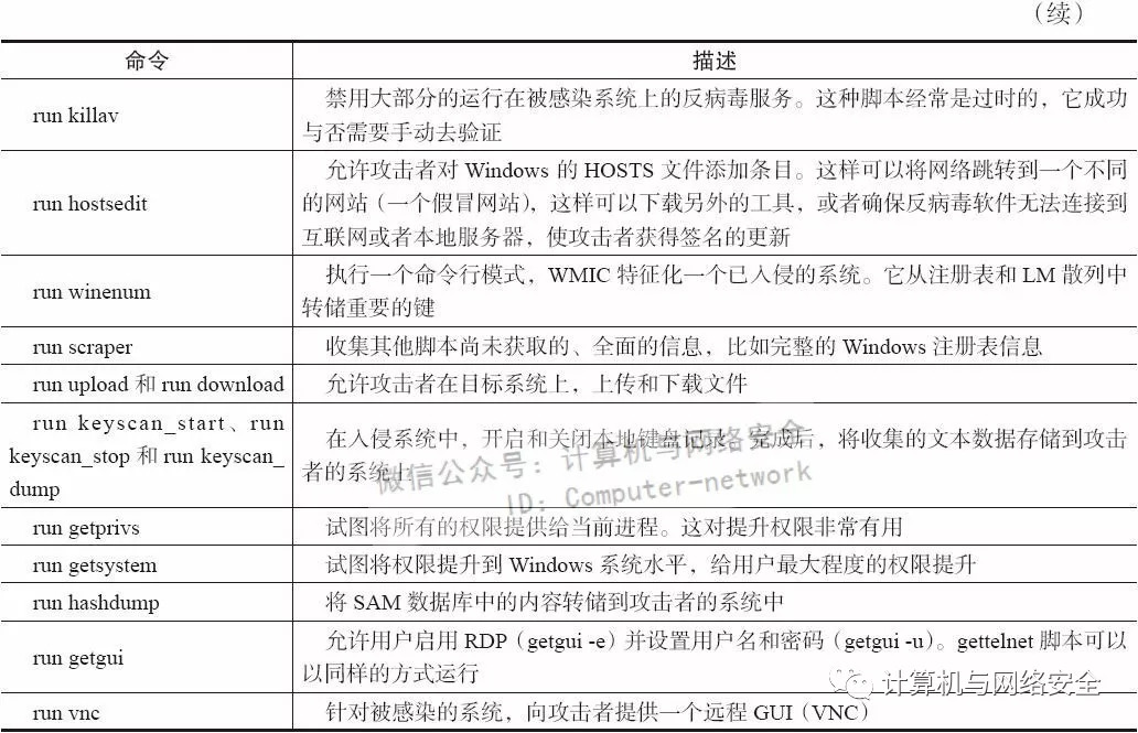 一些通过meterpreter使用的重要的后期利用模块见下表。