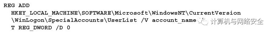 如果你创建一个新的用户账户,那么该账户会被任何一个登录进入被攻击系统的欢迎界面的用户注意到。为了使这个账户不可见,你需要用下列的REG命令行修改注册表: