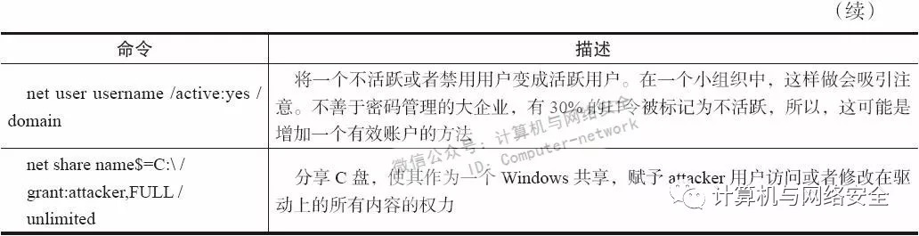 下面的命令是具有高度侵略性的,通常会被系统拥有者在应急响应程序中检测到。然而,它们会频繁地被一个攻击者采用,以此来转移对更持久的访问机制的注意,相关的命令参见下表。