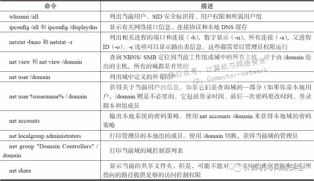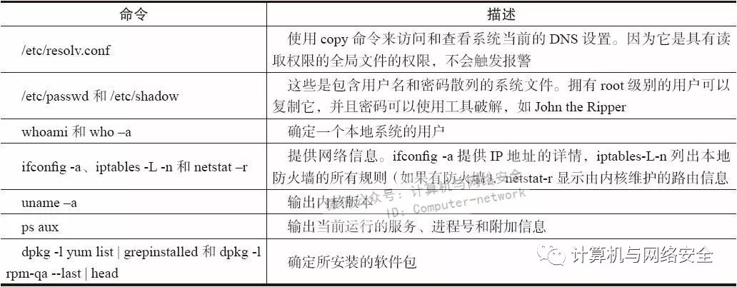 如果被入侵的系统是基于UNIX平台的,典型的本地侦察命令见下表。