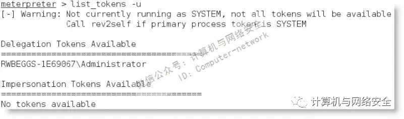 第一步是确定被感染系统上存在的所有有效的令牌。你可以看到令牌的个数,取决于你最初入侵目标系统所使用的访问级别。